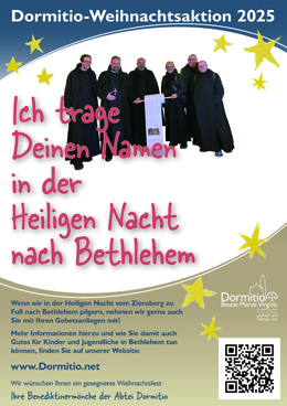Eine inzwischen seit einigen Jahren durchgeführte Aktivität der Hoffnung ist die Weihnachtsaktion der Benediktinerabtei Dormitio in Jerusalem: Jedes Jahr an Heiligabend machen sich die Mönche auf einen nächtlilchen Pilgerweg von Jerusalem nach Bethlehem und nehmen auf ihrem Weg eine Schriftrolle mit den Namen vieler Menschen mit, für die sie dann in der Geburtskirche in Bethlehem beten. Die Aktion steht unter dem Namen "Ich trage Deinen Namen in der Heiligen Nacht nach Bethlehem". Abt Nikodemus Schnabel weist in seinem aktuellen Friedensimpuls auch auf die Aktion hin.